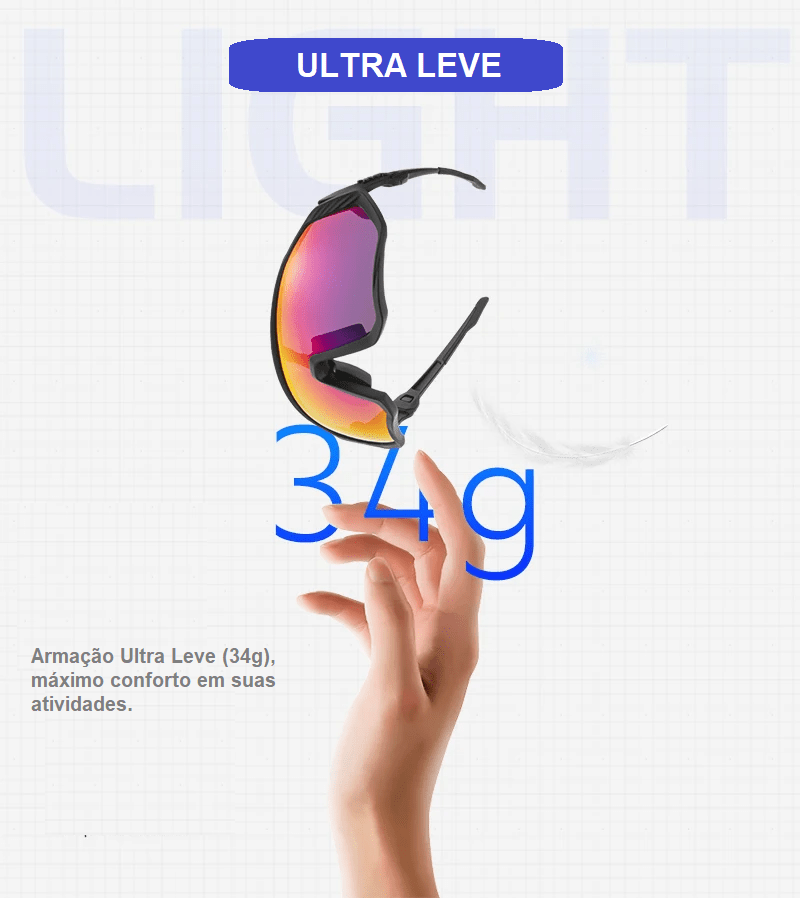 Seu design ultraleve de apenas 34g proporciona sensação de “nem estar usando óculos”, enquanto a armação de grau removível garante praticidade para quem precisa de correção visual sem abrir mão da estética.